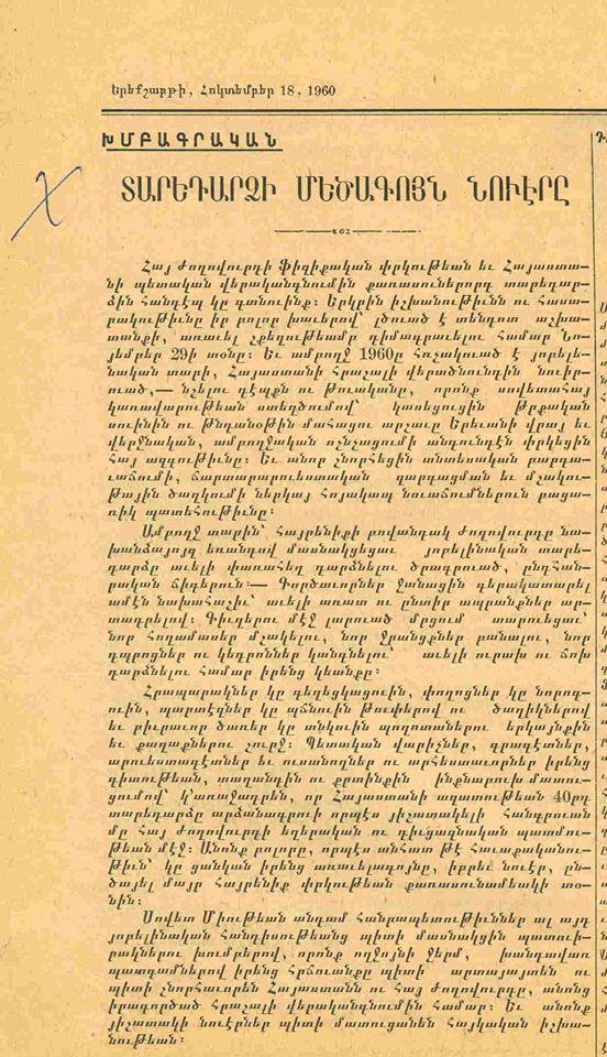 «Считаю, что, исходя из принципа интернационализма, надо удовлетворить просьбу армянской диаспоры, тем более что с Америкой у нас устанавливаются дружеские отношения».